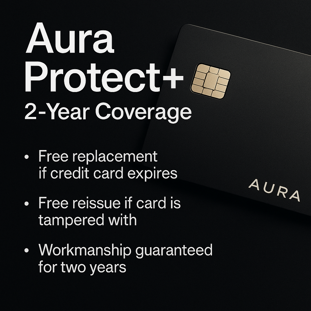Introducing Aura Protect+, a premium protection plan built to keep your custom metal card secure and supported for years to come.
